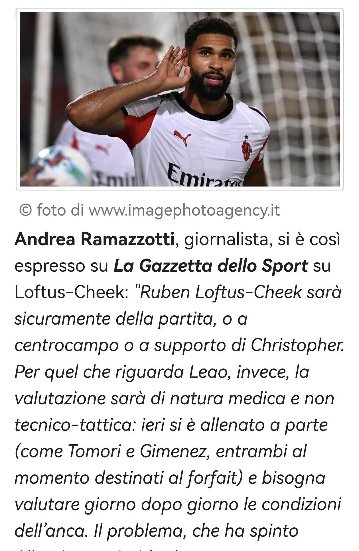 “鲁本·洛夫图斯-奇克必定会参与对阵罗马队的这场比赛,要么担任中场,要么作为克里斯托弗(恩昆库)的锋线搭档。至于莱奥,他能否出战将取决于医疗评估,而非战术需求:昨日他与托莫里、希门尼斯一同进行了单独训练(目前后两人大概率缺阵),其髋部状况需要每日观察。